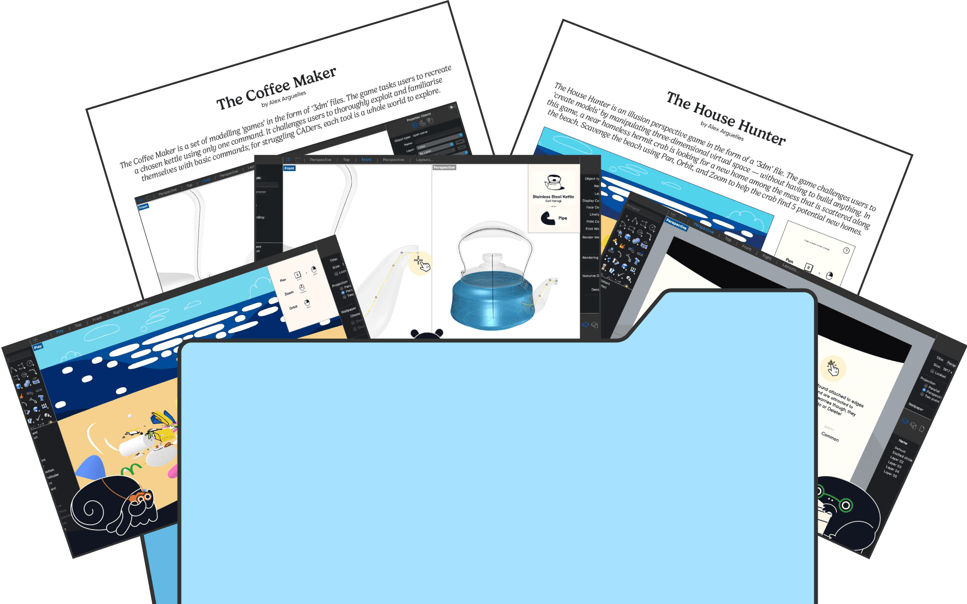 The game format shows potential as a way to document struggling CADers' learning process with Rhino. Rather than treating progress as invisible or purely outcome-based, the game creates tangible records of a designer's journey—championing the hermit crab's found homes, saving past attempts at kettles, or collecting a growing errorpedia. Designers can revisit these artefacts to reflect on how far they've come, turning what was once a source of frustration into a visible, personal learning archive.