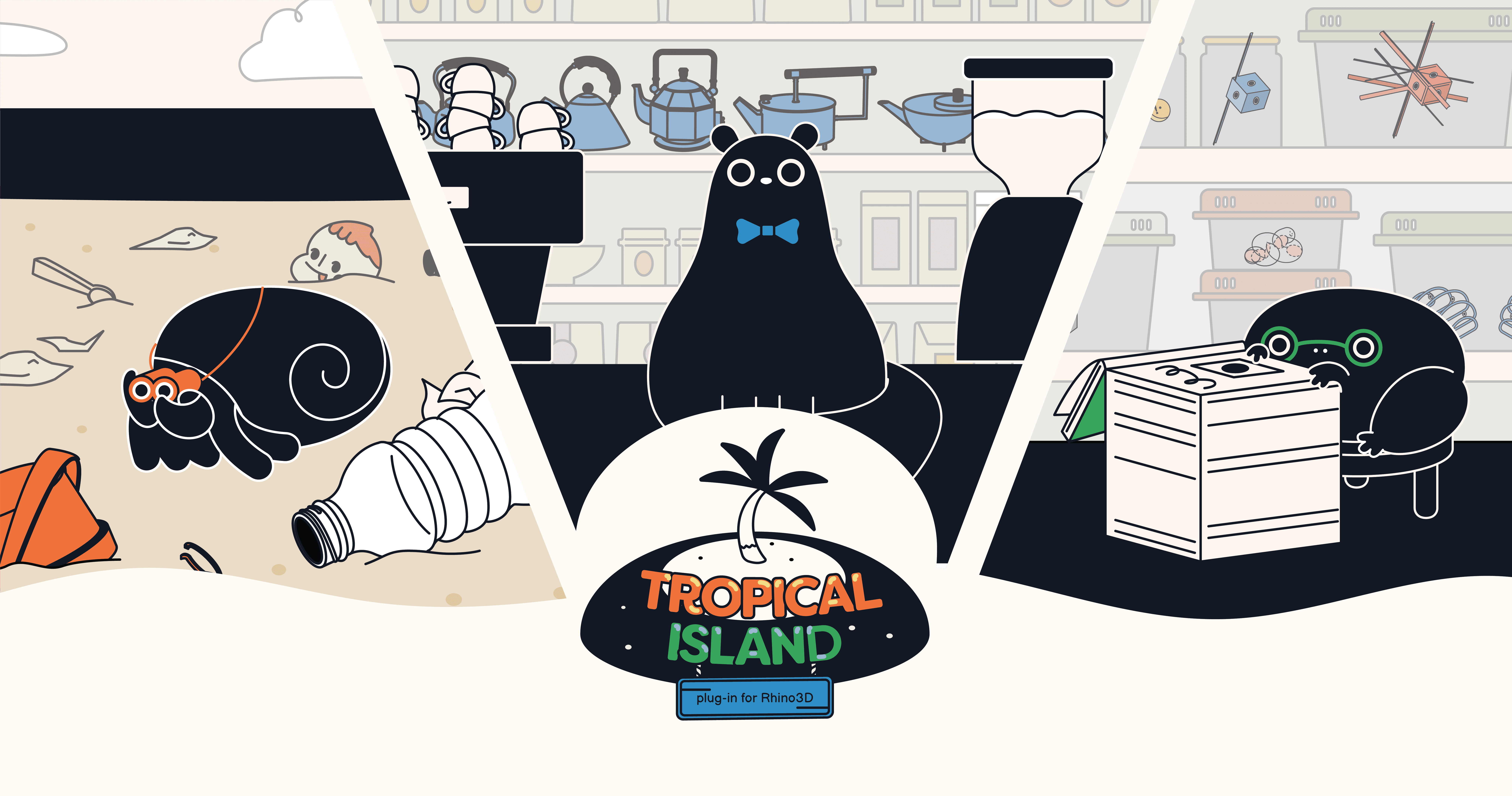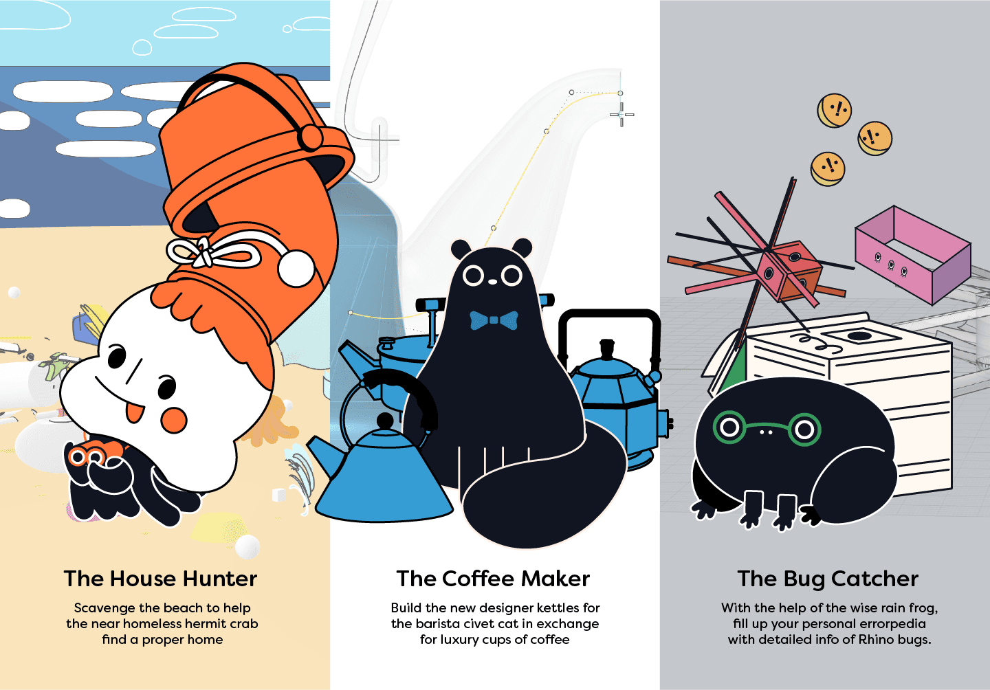 The Tropical Island plug-in game reimagines Rhino3D education as a discovery-driven journey, where novice designers explore and uncover its ‘secrets’. Rhino could (1) introduce virtual navigation skills at any pace, (2) reward mastery over a single tool, or (3) be a social network where designers learn and create mistakes together. A discovery-driven Rhino lets designers enjoy learning at their own pace. In doing so, it lowers the barrier of entry into the Rhino Club.
