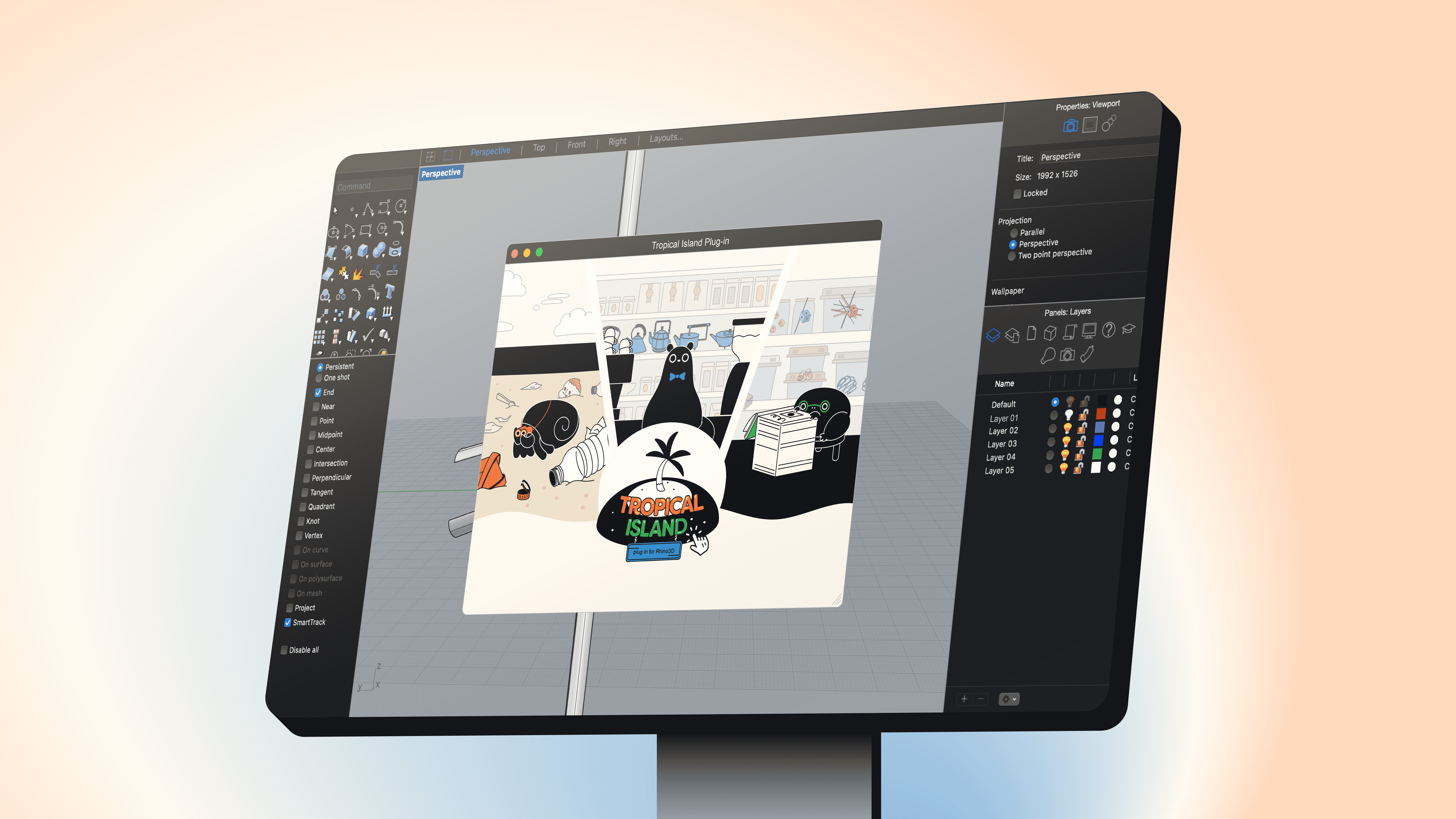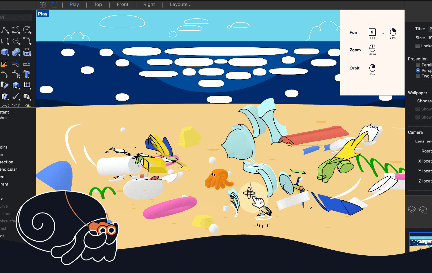 The Rhino virtual environment is transformed from a dull, grey, and overtly serious workspace, to a bright and colourful perspective puzzle. Using distorted models with purposeful layer materials, and a dedicated backdrop, Struggling CADers are able to focus solely on navigating the virtual space.